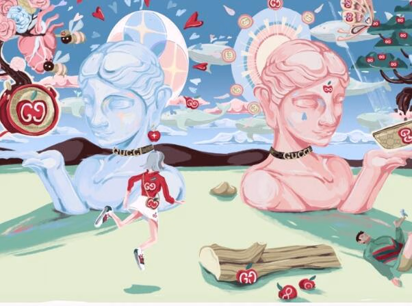 在中国情人节七夕的背景下,Gucci邀请中国艺术家朱剑辰(笔名剑辰)用艺术创作来阐释Gucci今年的GG with apple print背后的寓意,并用“魔法绘本游戏”的形式展现出来。剑辰擅长炼金术与神秘学的图式语言,他在波普的基础上,将狮子与鹰、环尾蛇、圣杯权杖等炼金术图腾融入画面,波提切利、卢梭等艺术家风格能在画面中看到影子,甚至来自中国明朝陈洪绶的作品也成为作品的灵感来源。