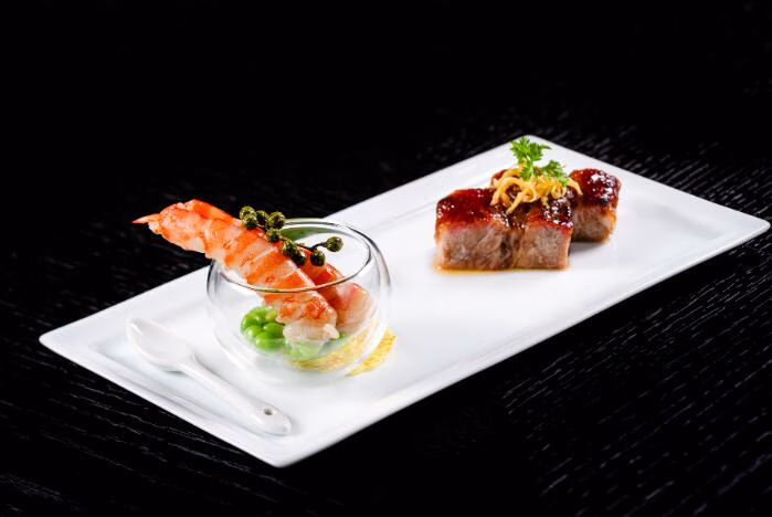 青花椒海虾,银鱼蜜汁叉烧,虾与银鱼的碰撞带来海洋的独特滋味,瞬间勾起浓厚的食欲,麻而不辛的青花椒则为海鲜注入别样滋味。搭配软嫩多汁、色泽鲜明的叉烧,营养美味且香味四溢,韵味深远。