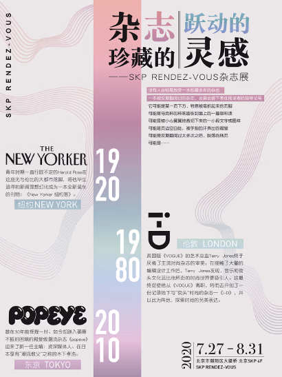 文学、生活、艺术、时尚、财经、科学,一本本被反复翻阅的杂志记录着世间百态。在电子阅读常态化的今天,杂志依然是我们保持独⽴、建构⾃我、修复精神家园的庇护所。SKP文化艺术季期间,“珍藏的杂志,跃动的灵感——SKP RENDEZ-VOUS外版杂志展”将率先与公众见面。从创刊于上世纪20年代、引领美国文学品味的传奇刊物《New Yorker 纽约客》,到30年前就风靡日本的殿堂级潮流杂志《PoPeye》,SKP RENDEZ-VOUS在世界范围内网罗珍贵杂志,浓缩近百年的潮流品味与厚重历史,让读者穿越时空,领略藏在纸张背后的动人风貌。