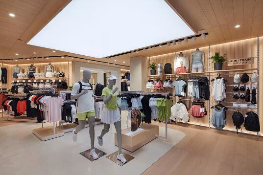 进入门店首先引入眼帘的是品牌引以为傲的裤装墙,产品教育家们将根据顾客不同运动需求推荐合适的裤装。更衣间内的暖色调灯光与实木材料相得益彰,为顾客营造出暂时远离都市喧嚣的闲适悠然氛围。此外,以无锡经典的拱门桥为剪影的“THE SWEAT LIFE”灯光艺术装置表达了品牌所倡导的热汗生活方式,预示着全新门店将与社区成员们一起共同点亮积极健康的热汗生活。