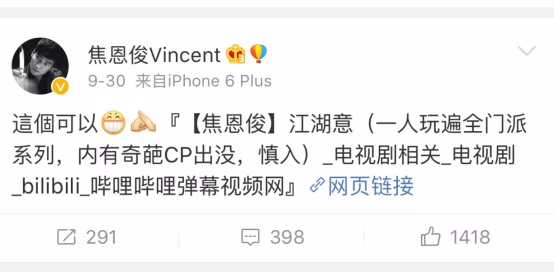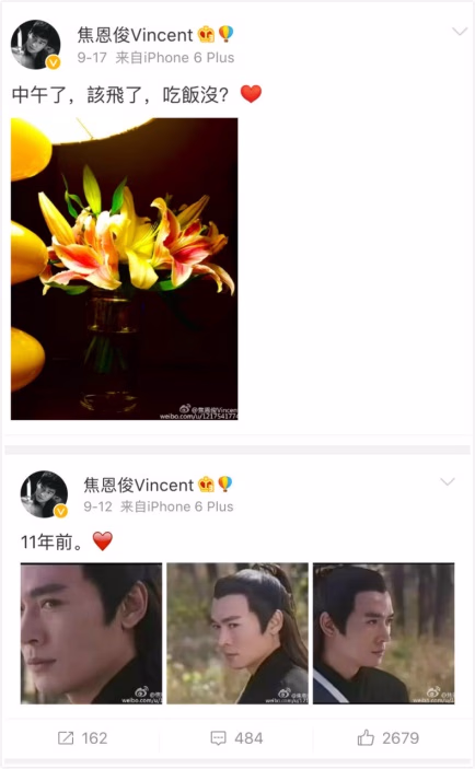 其实,一直以来,“古装美男纸”焦恩俊焦老大的微博在小编心目中的印象是这样的:有些小清新,偶尔与粉丝分享美景,或者感念一下从前的角色。