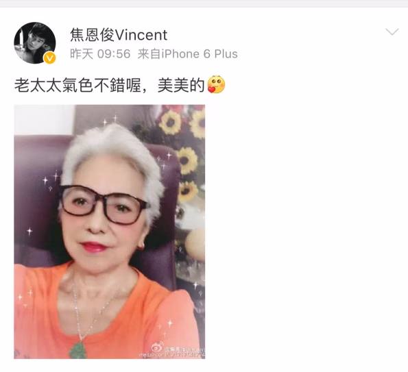 萌心大起的焦老大还用美颜相机大头贴,给自家老太太换了个“水冰月”的造型。老太太一秒钟变成青春美少女。