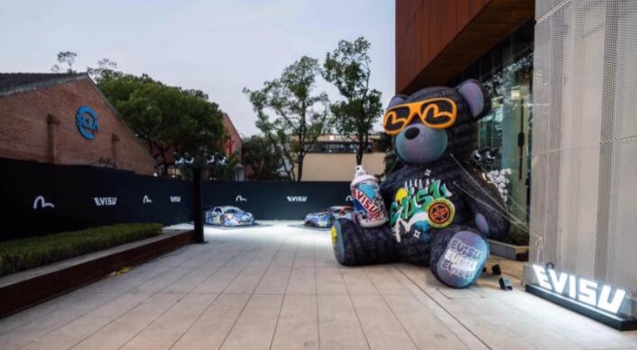 「M」海鸥LOGO是EVISU 30年不变的核心元素,品质保证是EVISU 30年不变的追求。30岁生辰来临之时,EVISU经典元素碰撞街头复古以艺术创新诠释30年不变的品牌精神。存在感十足的空间视觉装置----巨裤,源自经典EVISU Diacock Jeans裤型,裤腰处可见代表最高品质的编号01佛头皮牌。裤身将代表海鸥的双翼的M线加剧放大,Jackson Pollock式的七彩泼墨,随性泼洒其上街头感十足。另一超大艺术装置充气熊,采用代表性海鸥LOGO和图案Denim结合的布料材质,渗透街头文化基因的彩色涂鸦延伸在布熊上,在代表经典复古的东洋艺术与现代涂鸦艺术之间探索新的融合可能,以喷漆涂鸦打破视觉层次,表达玩味探索与年轻躁动。这也成为活动当晚最佳拍照打卡处。