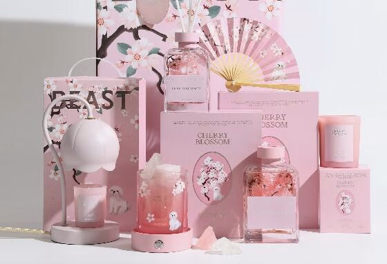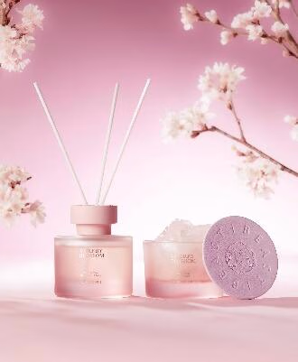 微笑樱花系列香氛产品以春日樱花和可爱小狗为灵感,调配不一样的樱花香——前调酸甜浆果香,明媚清新;中调樱花与芍药的香气,编织成一片花海;尾调透出温暖的麝香,春风满怀。