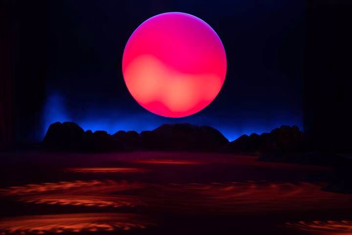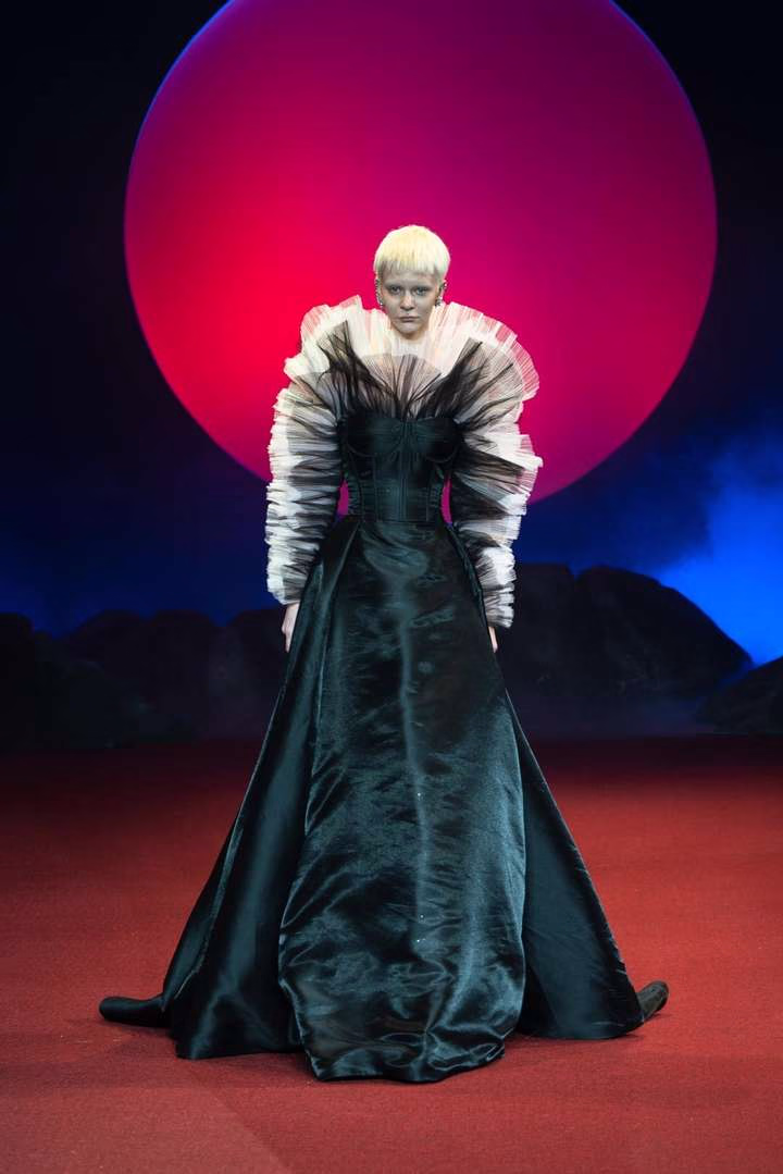 新品发布秀场营造一种沉浸式体验感,红色帷幕与墨蓝背景撞色融合,橙红灯光打造一轮巨日书写超现实幻境。观众席与秀台之间黑色镜面如水波蜿蜒,一种疏离感油然而生,似在眼前,亦似在彼岸。一曲高音咏叹调透彻秀场,恍若置身维也纳金色大厅入梦歌剧人生。数十位模特身穿轻纱礼服,游走于黑暗与光影之中。切身感受一场浪漫与现实的碰撞交融,鲜明个性,多元探索,异次美感,由视觉直击心扉。