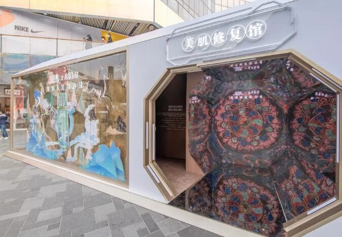 快闪店的设计灵感来源于敦煌257窟和329窟的壁画,以及佰草集太极系列产品的几何造型,四周透明玻璃墙面配以飞天、祥云、九色鹿等敦煌壁画元素,仙气缥缈,仿若搭乘时光隧道般穿越千年韶光。场馆内高科技的AI肌肤测试体验区,让现代科技感与国风传统美学得以完美融合。这场沉浸式的修复之旅,让大家不用去敦煌就能了解敦煌壁画,了解壁画修复的过程。