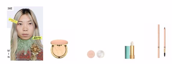 化妆师使用Poudre de Beauté Mat Naturel丝润柔焦凝光粉饼(01号色)为Min打造出柔滑裸妆效果,再用Éclat De Beauté Effet Lumière丝润高光晶露提亮眼部肤色,接着使用Baume à Lèvres倾色柔纱润唇膏(01号色Joslyn Clair 玲珑女郎)修饰唇部,最后使用Crayon Définition Sourcils绝视佳人粉眉笔(01号色)令眼部轮廓更为突出。