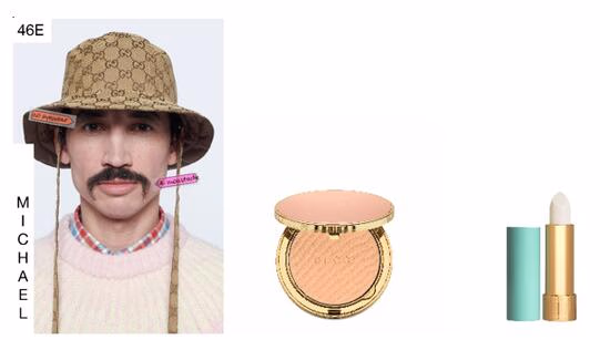 妆容中还使用到了古驰彩妆的其他产品,如新款Poudre de Beauté Mat Naturel 丝润柔焦凝光粉饼——一款可叠加使用的粉饼,打造细腻均匀、光滑自然的底妆效果。多款Rouge à Lèvres唇膏亦用于此次秀场妆容之中,以及全新Vernis à Ongles秀色在握指甲油——一款有多种色调、炫亮持久的指甲油。
