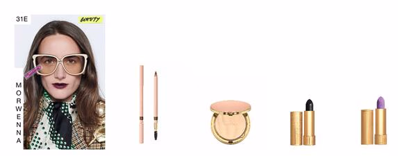 Morwenna在这次古驰“终曲”时装系列发布中展示出大胆的唇妆,结合了两款古驰唇膏——一款是天鹅绒般质地的Rouge a Lévres Mat倾色绒雾唇膏605号色Vienna Amaranth,另一款则为轻盈滋润的Rouge à Lèvres Satin倾色丝润唇膏700号色Crystal Black黑水晶。她的眉部由Gucci Beauty’s Crayon Définition Sourcils绝视佳人粉眉笔(04号色)勾勒,这款粉质眉笔上色顺滑,具有哑光效果,与Poudre de Beauté Mat Naturell丝润柔焦凝光粉饼(01号色)打造的天然肤色相得益彰。