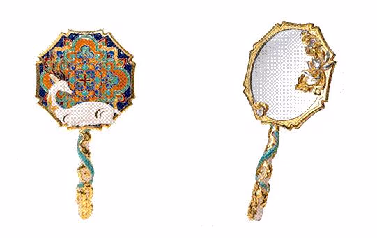 美妆镜整体由24k纯金和银共度镀造,手柄运用田白玉材质铸造,图案则采用珐琅工艺,使得作品的整体色感与运用同系列彩妆所打造的主题色“敦煌红”、“璎珞金”和谐呼应,整体造型小巧精致适合日常携带使用。